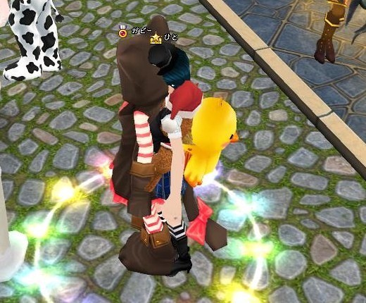 ひよこに背負われてます(●ノ∀`)゚o。アヒャャ