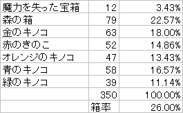 きのこの森では魔箱+森箱で25%程度、青い花掘りイベ(花箱は30%程度だったそう)ほどではありませんがかなり箱率がいいみたいですね~
