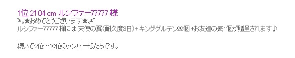| 1位★:゚*☆※>('-'*)♪オメデトウ♪(*'-')<※★:゚*☆ |