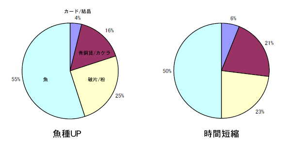 結果は・・・何て言うか・・・こんなでした。 サンプル数は100、結果では魚種UPより時短の方が良い感じで出てますが、魚の量が違ってるので、とりあえず大きな差は無い、と言ったところでしょうか。
