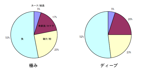 続いて確認したのが餌による材料の違い。こちらは予想通りでしょうか? カード/結晶の含有量は変わらず、ディープはカケラが多目、極みは粉が多目です。