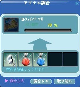 昨日、やっとこさミルウェイのBパーツの材料集めが一回分終わり、とりあえず確率を見てみる事に