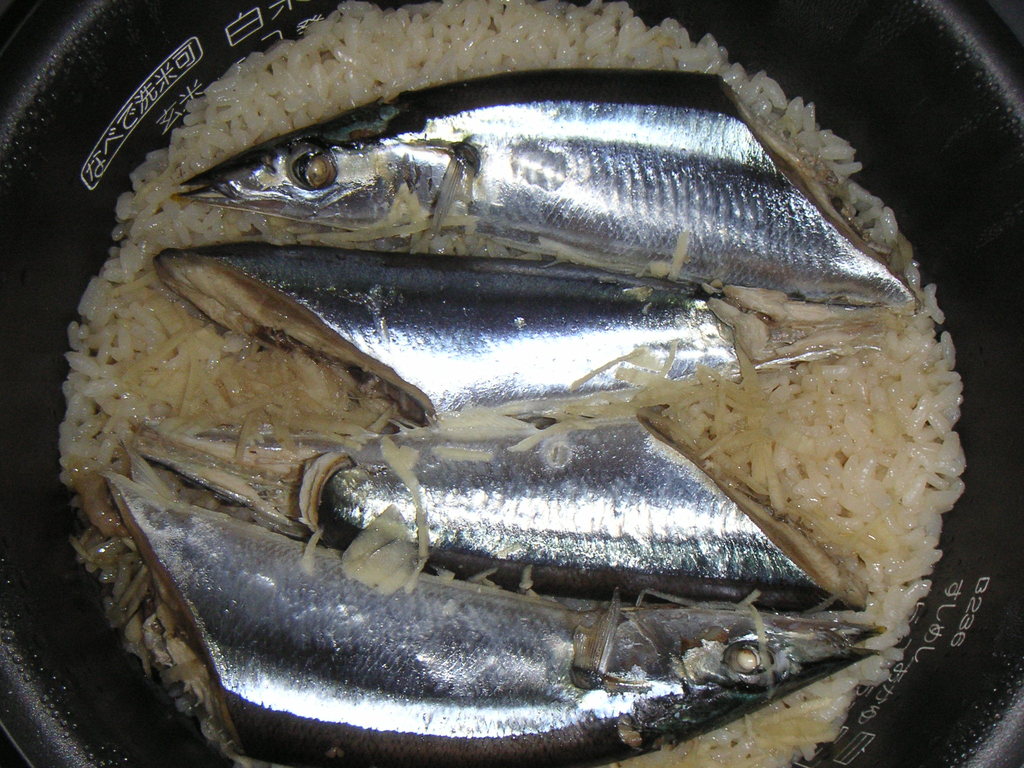 ②頭と尻尾を落とした秋刀魚を、半分に切ってお米の上にのせる