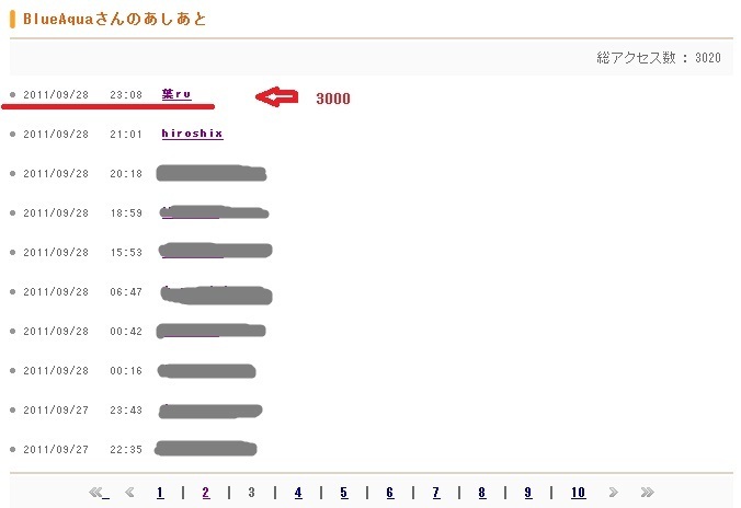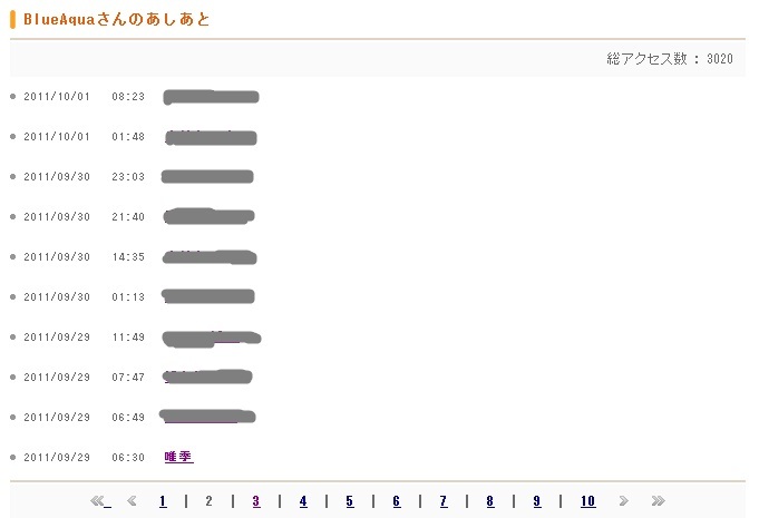 で、あしあと履歴のページって、1ページに10人の履歴が載るんですね。