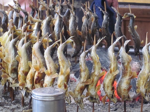 囲炉裏で串に刺して焼いてる風景いいなぁ^^ |