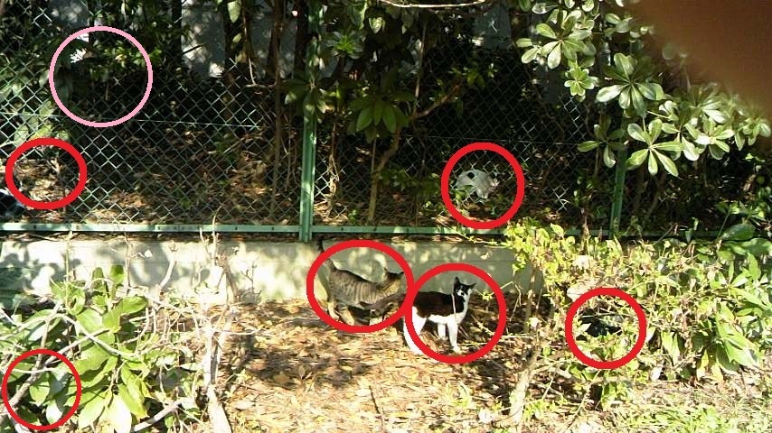 はっきりネコだと確認出来るのは3匹(①手前の茶色と②黒いの それと③奥の白いの)
