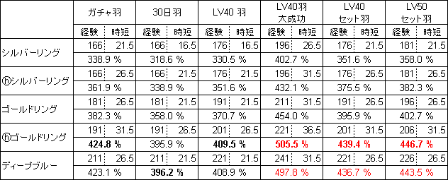 表中にはありませんが 30日大成功羽 (経験+40% 時短+10%) は、属性的にみて、セットアイテム羽に勝り、LV40羽 大成功に劣るので、1.5位の位置づけとなります。