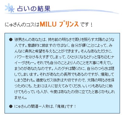 MILUのコスチューム占いなるものをハッケン☆『+』ー`o)ニヤ━━リ
