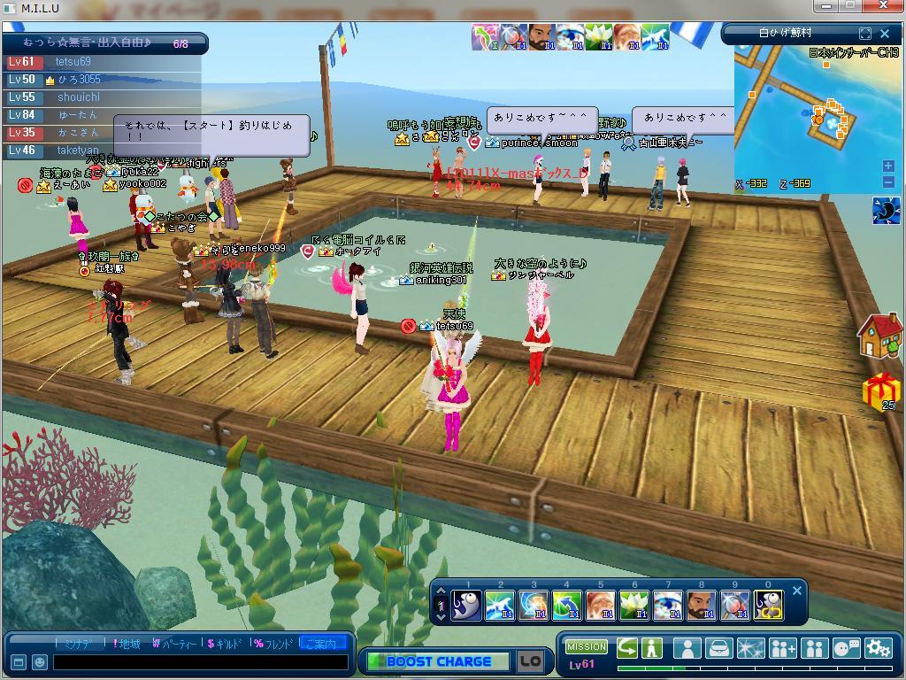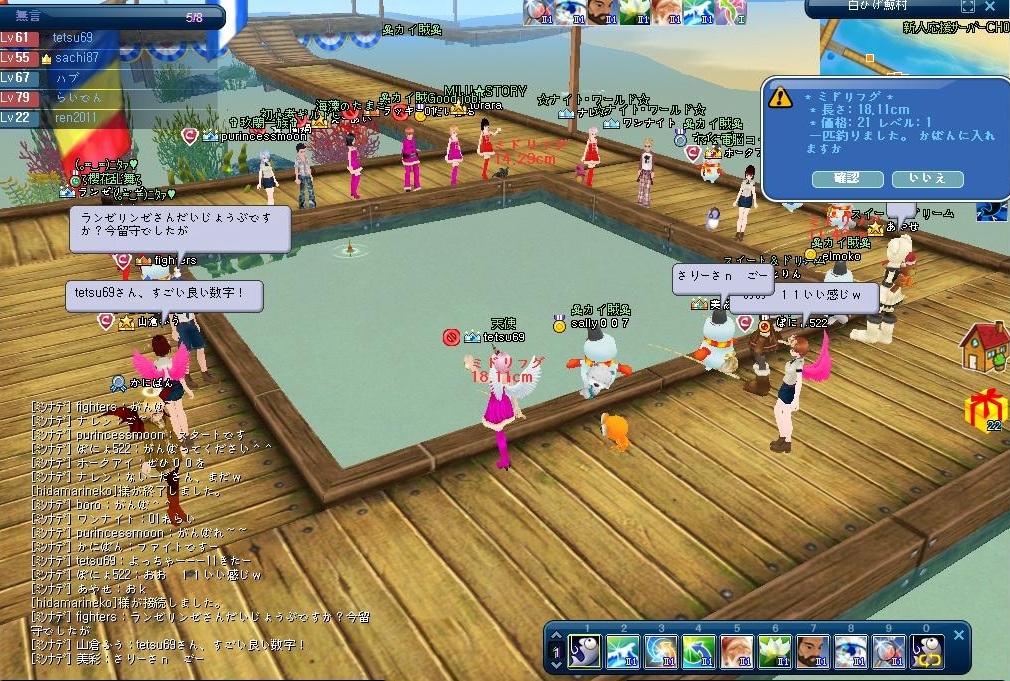 私はこれは初めてだったんですけど、イケス4面に均等の人数が並んで、左端から順番に釣っていき、釣り上げた魚の小数点以下が小さい方から徐々に大きくしていき、最終の釣る人が『クレッシエンド』と叫んで、その叫ぶのが一番早いチームが勝ちです☆