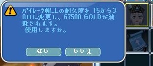 さきほど今回のイベでつくった帽子(Lv50)の延長をしたら6万7500Gだったので、不具合掲示板にでている、耐久延長費の質問のことを思い出した次第です。