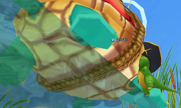 先日、亀1さんの所で釣っていたのですが、気づいたら放置ペットのワニさんが亀に顔を突っ込んでいました。竿を投げるとこんな感じ。けっこうシュール。下の方から見ると、池のオブジェクトのエッジが綺麗に区切ってあって。