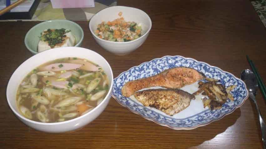 うどん(エスニックスープ)、鮭&鰤のソテー・キノコのバターソテー添え、冷や奴、納豆と刻み野菜のサラダ・・・