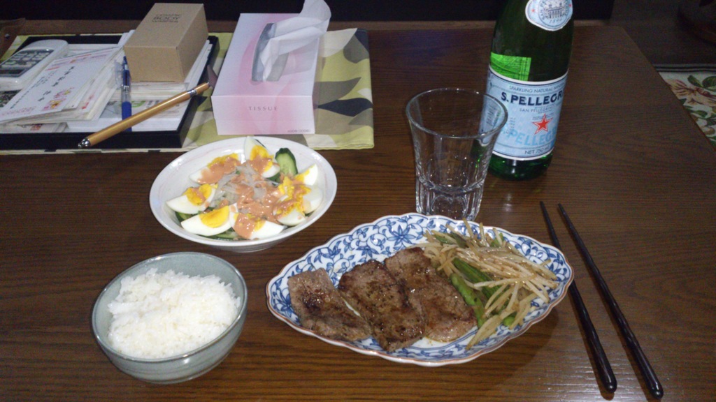 ステーキ、もやしと冷凍絹さやの炒め、卵とタマネギ、キュウリとサヤエンドウのサラダ・・・ご飯と炭酸水で・・・
