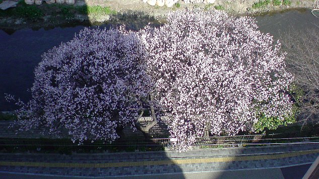 川沿いに、桜並木なんだけど、4本だけ、梅なんだ。