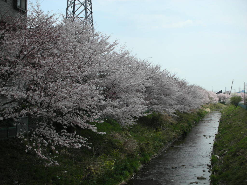 下の川に花びらが浮いて