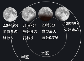 実際は18:59以前にはじまっているのですが、地平線の下なので普通に見えるのが19:00~21:00くらいの間の天体ショーです。(部分食の後の半影食はちょっと判りづらいかな?とも思います。)