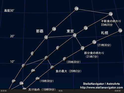 大阪あたりより東側では月食(本影食)の経過を最初から最後まで見ることができるのですが、そこより西では月が欠け始めてから、東の地平線に昇ってきますよ。