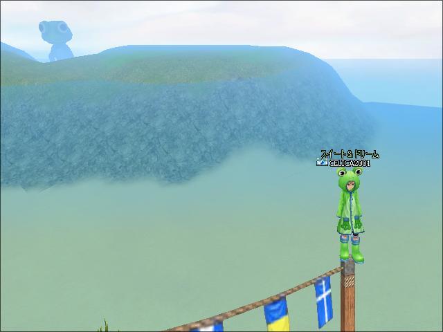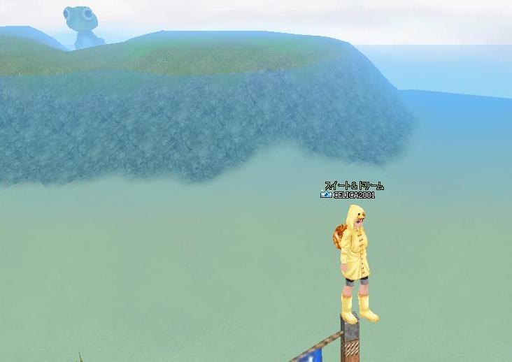 まずは、「GB=ゴールデン・ビーチ」亀3側生簀の端から奥の小島に鎮座するカエルを望む♪