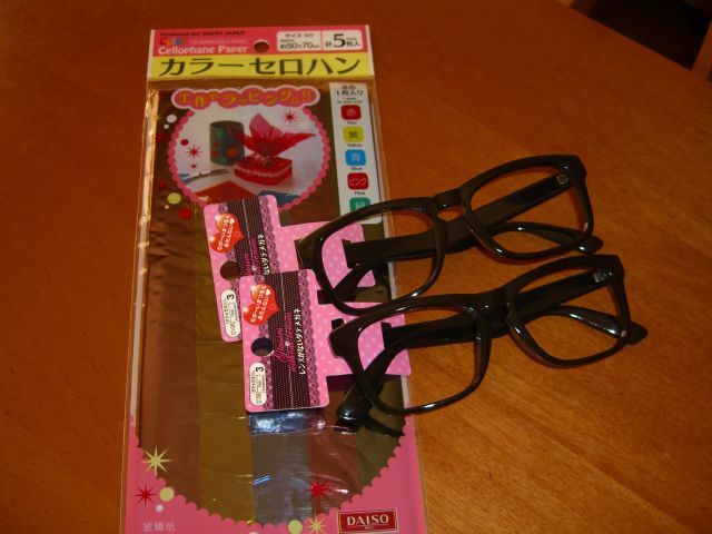100円ショップからセロハンとレンズなしメガネ買って