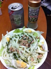 今夜はレタスとおうどんと、ツナとゆで卵にこれをかけてサラダうどんにしました。