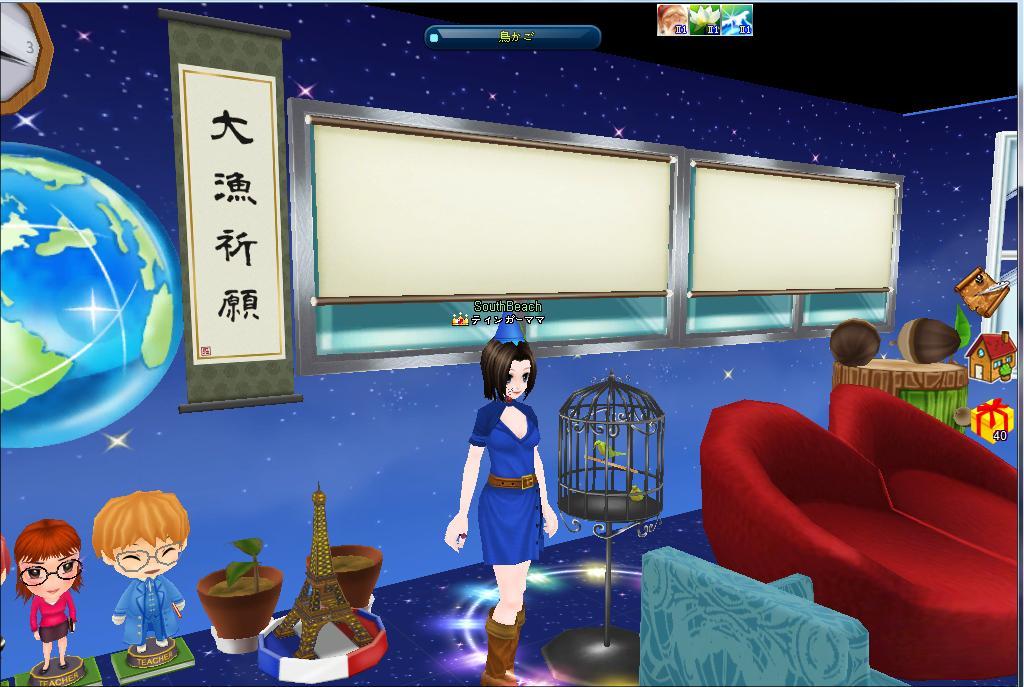 エフェル塔の後ろに世界地図と大漁祈願の掛け軸、そして魔法スクールの先生たち…