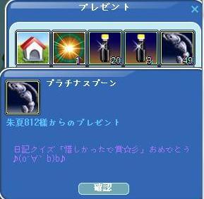 もう、皆様も・・さんま100匹は終わってるかなぁ~次、トモちゃんねwなんか、『さん×ま=24』なんてイベも・・あるみたいね 朱夏ちゃんの日記イベの賞品が届きました♪ ありがちゅっ(^・^)♪さんま釣りクエの完了報酬の課金餌で・・釣ってみた(´-ω-`)う~ん・・・・・60餌で、充分かもww2回目の100万G券も、D餌から(・`ω・)ゞデシッ!! イマイチが、力持ちになりました♪だーりん❤は、物凄く忙しくて…へとへと、、、PCの電源入れて起動中に寝ちゃうらしい、、、お話は、してるけど・・( ˇ ⊖ˇ)フンフーン♪土曜日は、寝っちの日 の 予定なり♪少し、浮上・・w続く・・w