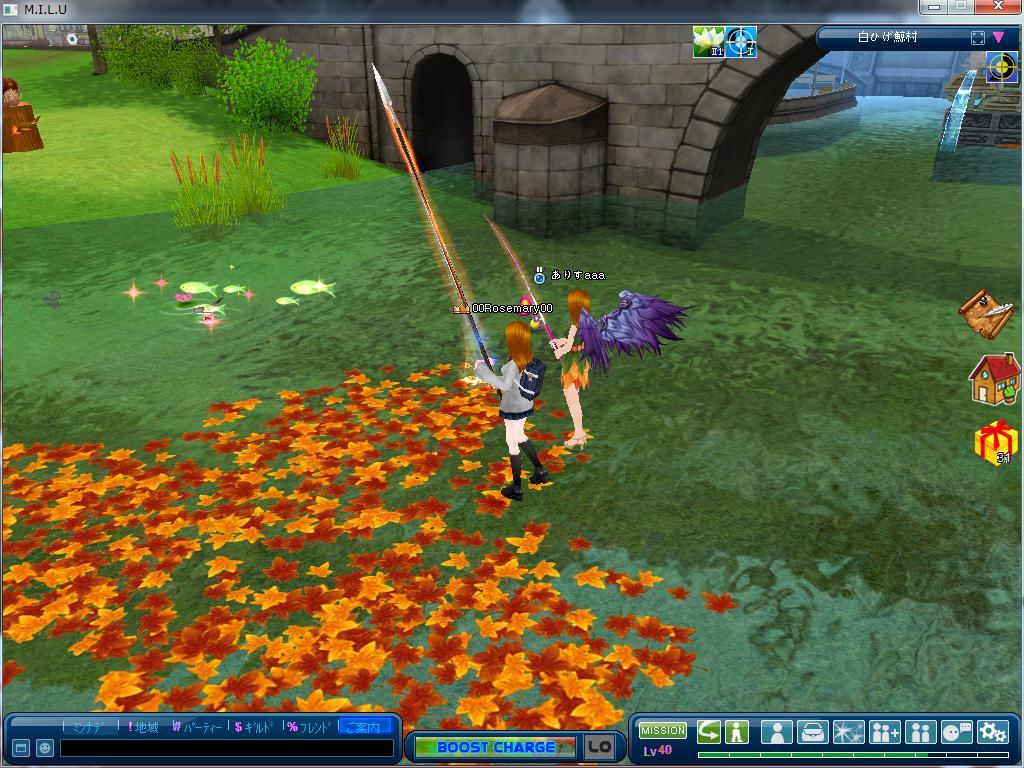 ありすちゃんと落ち葉の上で釣りしました >゜))))彡