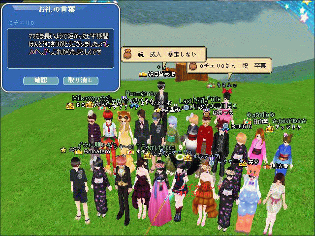 告知をしていたとおり、本日22:20、30女のoチェリoさんの卒業式を行ないました。