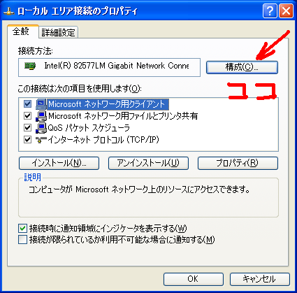 ”接続”からLANカードのプロパティを開け、