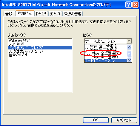 「100Mbps+フルデュプレックス」を手動設定する、