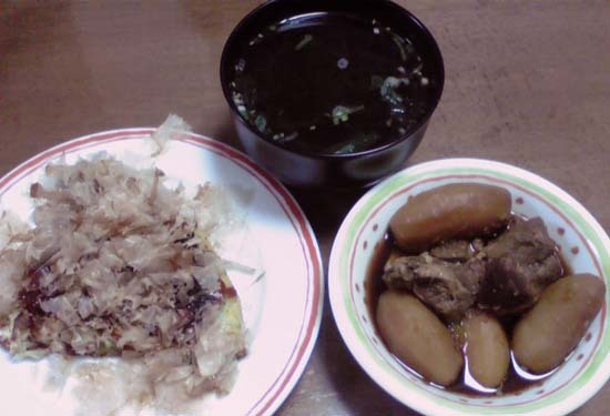 今日の晩ご飯は、納豆入りお好み焼き・豚とジャガイモの柔らか煮・もずくスープでした