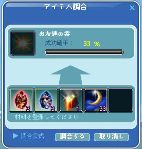 最後に。今回のペットが可愛いので、露店で友達の素を売るか、コグマをひっ捕まえるか悩みましたがw、素を売ろうとシャシャさんで調合して1回で成功^^ホクホクです^^