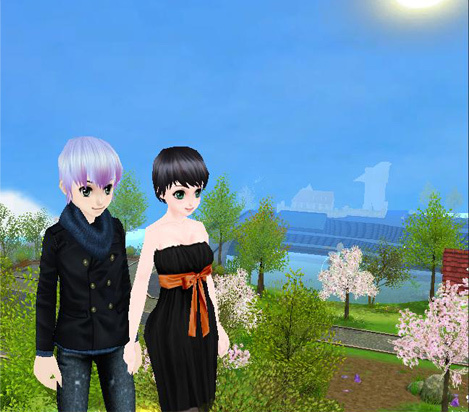 櫻をバックに