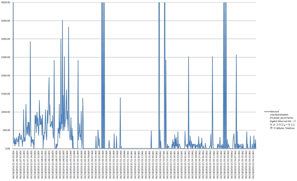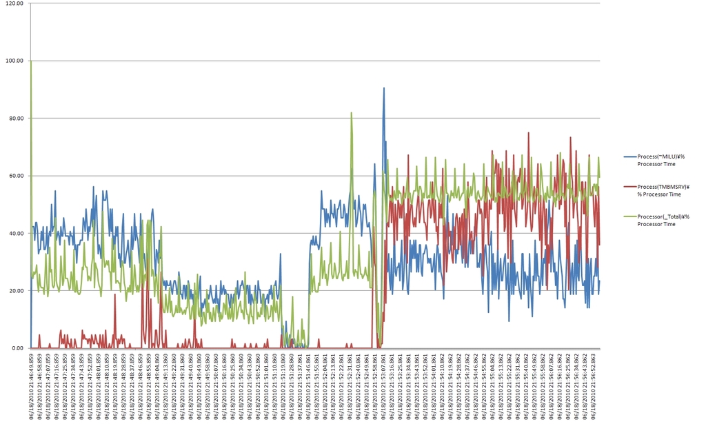 計測項目は以下の通りです。 Process(~MILU)% Processor Time Process(TMBMSRV)% Processor Time Processor(_Total)% Processor Time Network Interface(...)Bytes Total/sec