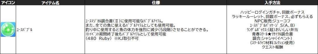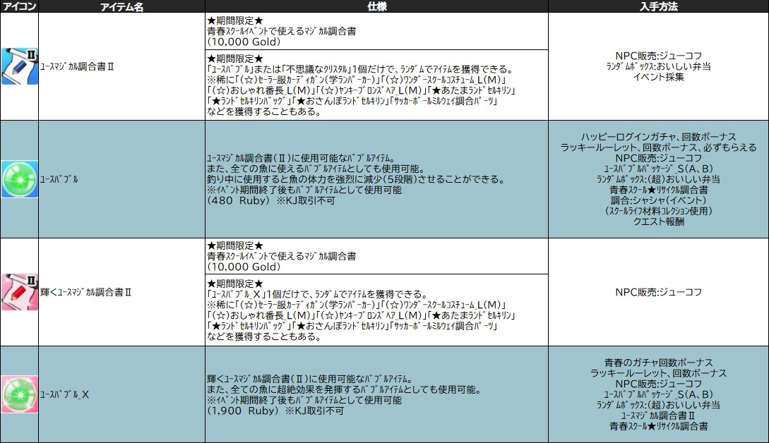 ※「 ユースマジカル調合書 」「 輝くユースマジカル調合書 」「 青春スクール★リサイクル調合書 」の使用用途はなくなります。