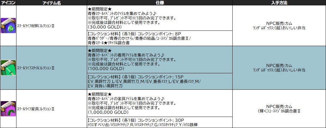 ※「 スクールライフ材料コレクションⅡ 」「 スクールライフスタイルコレクションⅡ 」「 スクールライフ家具コレクションⅡ 」は調合に使用できなくなります。