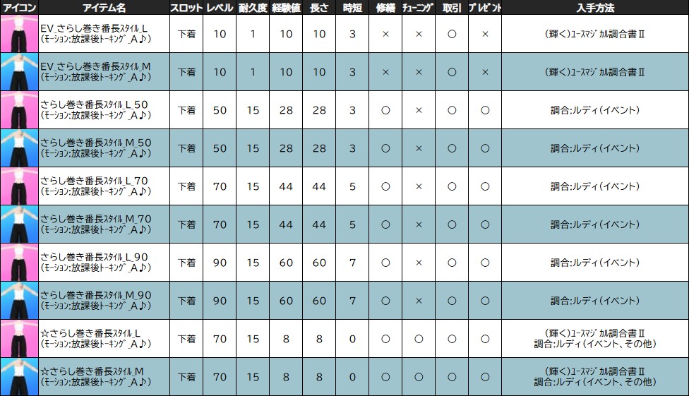 【 輝くユースマジカル調合書Ⅱ 入手イベントアイテム 】 ・☆おしゃれ番長_L ・☆おしゃれ番長_M ・☆さらし巻き番長スタイル_L ・☆さらし巻き番長スタイル_M ・☆セーラー服カーディガン ・☆ヤンキーブロンズヘア_L ・☆ヤンキーブロンズヘア_M ・☆ワンダースクールコスチューム_L ・☆ワンダースクールコスチューム_M ・☆学ランパーカー ・★あたまランドセルキリン ・★おさんぽランドセルキリン ・★ランドセルキリンイヤリング_L ・★ランドセルキリンイヤリング_M ・★ランドセルキリンバッグ ・★ランドセルキリン浮き ・1,000万ゴールド交換券 ・100万ゴールド交換券 ・500万ゴールド交換券 ・EV_オールドスクールバッグ_L ・EV_オールドスクールバッグ_M ・EV_おしゃれ番長_L ・EV_おしゃれ番長_M ・EV_さらし巻き番長スタイル_L ・EV_さらし巻き番長スタイル_M ・EV_セーラー服カーディガン ・EV_ティーチャーバッグ ・EV_ホワイトハイヒール ・EV_ホワイトレザーシューズ ・EV_ヤンキーブロンズヘア_L ・EV_ヤンキーブロンズヘア_M ・EV_ランドセルキリンイヤリング_L ・EV_ランドセルキリンイヤリング_M ・EV_ワンダースクールコスチューム_L ・EV_ワンダースクールコスチューム_M ・EV_学ランパーカー ・EV_極細サングラス_L ・EV_極細サングラス_M ・EV_黒板消しトラップ ・おしゃれ番長_L ・おしゃれ番長_M ・お友達の素 ・お友達の素_ティーチャー専用 ・お友達の素_ランドセルキリン専用 ・サッカーボールミルウェイ調合パーツ ・スクールライフ家具コレクションⅡ ・セーラー服カーディガン ・ティーチャードール ・ハウスすべり台 ・ハウスタイヤチェア_G ・ハウスタイヤチェア_R ・ハウスタイヤチェア_Y ・ハウス鉄棒 ・ヤンキーブロンズヘア_L ・ヤンキーブロンズヘア_M ・ランドセルキリンドール ・ワンダースクールコスチューム_L ・ワンダースクールコスチューム_M ・英知の房飾り ・学ランパーカー ・幸運のリストバンド ・硬派なさらし布 ・純粋青稲妻のかけら ・純粋青稲妻パウダー ・純粋赤彗星のかけら ・純粋赤彗星パウダー ・青春ヘアワックス ・秘密の栞 ・不思議な指示棒 ・魔法の銀の破片 ・魔法の銀貨 ・万能消しゴム