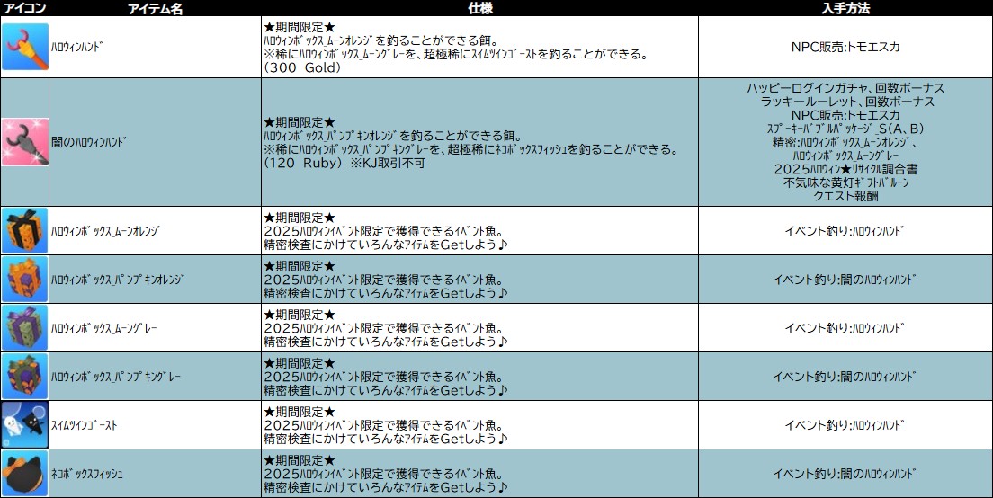 ※「 ハロウィンボックス_ムーン(パンプキン)オレンジ 」「 ハロウィンボックス_ムーン(パンプキン)グレー 」「 スイムツインゴースト 」「 ネコボックスフィッシュ 」は釣れなくなり、