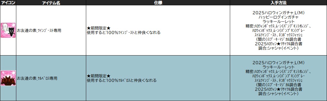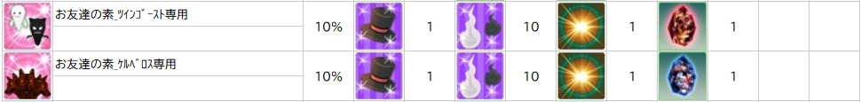 ※「 お友達の素_ツインゴースト専用 」「 お友達の素_ケルベロス専用 」の調合可能期間は11月5日(水)定期メンテナンスまでとなります。