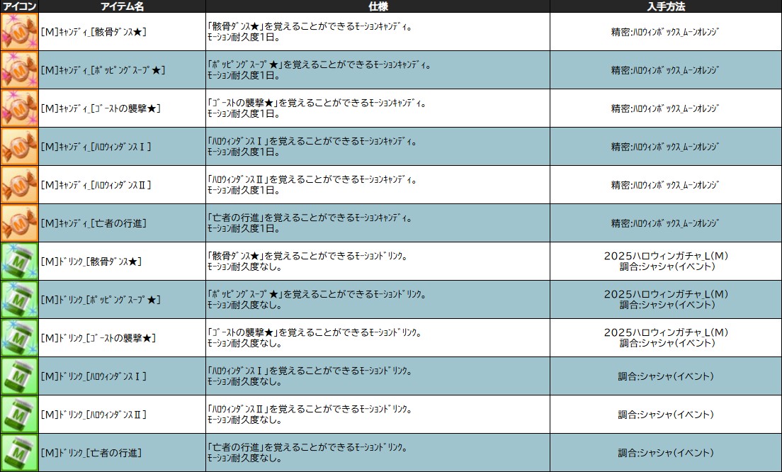【 ハロウィンボックス_ムーンオレンジ 入手イベントアイテム 】 ・[M]キャンディ_[ゴーストの襲撃★] ・[M]キャンディ_[ハロウィンダンスⅠ] ・[M]キャンディ_[ハロウィンダンスⅡ] ・[M]キャンディ_[ポッピングスープ★] ・[M]キャンディ_[骸骨ダンス★] ・[M]キャンディ_[亡者の行進] ・100万ゴールド交換券 ・10万ゴールド交換券 ・2025ハロウィン★リサイクル調合書 ・5,000ゴールド交換券 ・500万ゴールド交換券 ・50万ゴールド交換券 ・5万ゴールド交換券 ・EV_ウィッチの杖_L ・EV_ウィッチの杖_M ・EV_ダークピエロ_L ・EV_ダークピエロ_M ・EV_バンデージヘッド_L ・EV_バンデージヘッド_M ・EV_ピエロミニハット ・EV_ピエロメイク_L ・EV_ピエロメイク_M ・アップルスプーン ・お祝いクラッカー ・お友達の素_ケルベロス専用 ・お友達の素_ツインゴースト専用 ・カチコチキャンディ ・スクリームソウル ・スプーキーバブル ・スプーキーマジカル調合書 ・ハロウィンアウトフロア_紫 ・ハロウィンウォール_紫 ・ハロウィンソファ_グリーン ・ハロウィンソファ_ブラック ・ハロウィンバッジ_A ・ハロウィンバッジ_B ・ハロウィンバッジ_C ・ハロウィンフロア_紫 ・フォーチュンコイン ・もろい青稲妻のかけら ・もろい青稲妻パウダー ・もろい赤彗星のかけら ・もろい赤彗星パウダー ・ルナムーンヴァンパイア ・ワイドスターマインA ・ワイドスターマインB ・闇のスプーキーバブル ・闇のハロウィンハンド ・異界のシルクハット ・恐怖のスタイルコレクション ・恐怖の材料コレクション ・極みハニーグルテン ・月の涙 ・蜘蛛の巣クッション_黒 ・蜘蛛の巣クッション_紫 ・中級クラッカー ・中級ポータル注文書 ・不気味な黄灯ギフトバルーン ・魔女の呪術書 ・魔法の青銅の破片 ・魔法の青銅貨 ・魅惑の月の涙