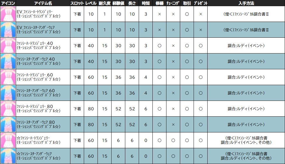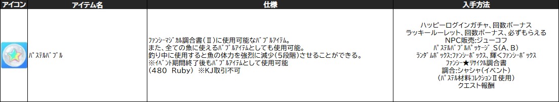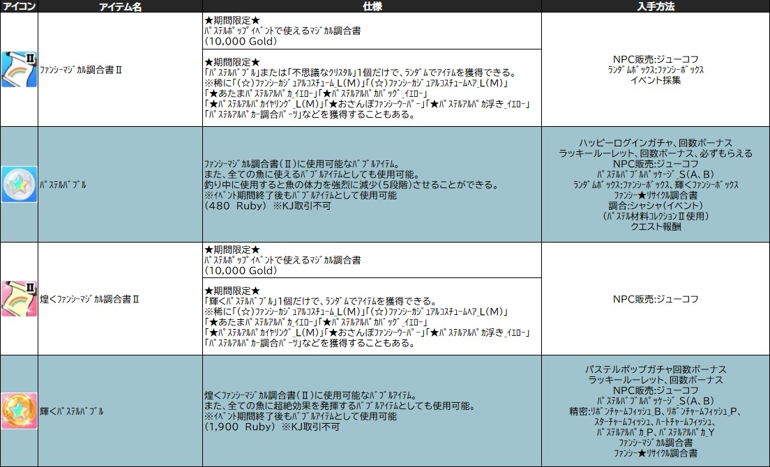 【 ファンシーマジカル調合書Ⅱ 入手イベントアイテム 】 ・☆ファンシーカジュアルコスチューム_L ・☆ファンシーカジュアルコスチューム_M ・☆ファンシーカジュアルコスチュームヘア_L ・☆ファンシーカジュアルコスチュームヘア_M ・☆ファンシースターアンダーウェア ・☆ファンシーハートランジェリー ・★あたまパステルアルパカ_イエロー ・★おさんぽファンシーウーパー ・★パステルアルパカイヤリング_L ・★パステルアルパカイヤリング_M ・★パステルアルパカバッグ_イエロー ・★パステルアルパカ浮き_イエロー ・★黄金の錨パッケージ ・★銀の錨パッケージ ・1,000万ゴールド交換券 ・100万ゴールド交換券 ・10万ゴールド交換券 ・500万ゴールド交換券 ・50万ゴールド交換券 ・EV_おさんぽパステルアルパカ ・EV_カラフルハートチョーカー_L ・EV_カラフルハートチョーカー_M ・EV_パステルアルパカイヤリング_L ・EV_パステルアルパカイヤリング_M ・EV_パステルアルパカバッグ_パープル ・EV_パステルアルパカ浮き_パープル ・EV_パステルパールシェルソファ ・EV_パステル噴水フロート ・EV_ファンシーカジュアルコスチューム_L ・EV_ファンシーカジュアルコスチューム_M ・EV_ファンシーカジュアルコスチュームヘア_L ・EV_ファンシーカジュアルコスチュームヘア_M ・EV_ファンシースターアンダーウェア ・EV_ファンシーハートランジェリー ・EV_ファンシーリボンイヤリング_L ・EV_ファンシーリボンイヤリング_M ・EV_ポップリュックサック ・お友達の素 ・お友達の素_パステルアルパカ専用 ・お友達の素_ファンシーウーパー専用 ・ときめくパステルインク ・パステルアルパカー調合パーツ ・パステルアルパカドール_イエロー ・パステルアルパカドール_パープル ・パステルアルパカの毛玉 ・パステルクォーツ ・パステルシェルフ ・パステルシャンデリア ・パステルチェスト ・パステル家具コレクションⅡ ・ファンシーウーパードール ・ファンシーカジュアルコスチューム_L ・ファンシーカジュアルコスチューム_M ・ファンシーカジュアルコスチュームヘア_L ・ファンシーカジュアルコスチュームヘア_M ・ファンシーソファ_Left ・ファンシーソファ_Right ・ファンシーワックス ・ポップなバッテリー ・もろい青稲妻の結晶 ・もろい赤彗星の結晶 ・輝くパステルバブル ・騎士の証 ・純粋青稲妻のかけら ・純粋青稲妻パウダー ・純粋赤彗星のかけら ・純粋赤彗星パウダー ・女神の涙 ・神の恵み ・不思議なシャボン玉液 ・魔法の銀の破片 ・魔法の銀貨 ・魔法の青銅カード ・煌めくパステルリボン