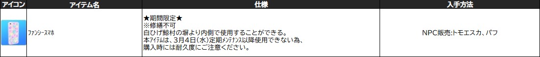 ※採集道具の「 ファンシースマホ 」の使用用途はなくなります。