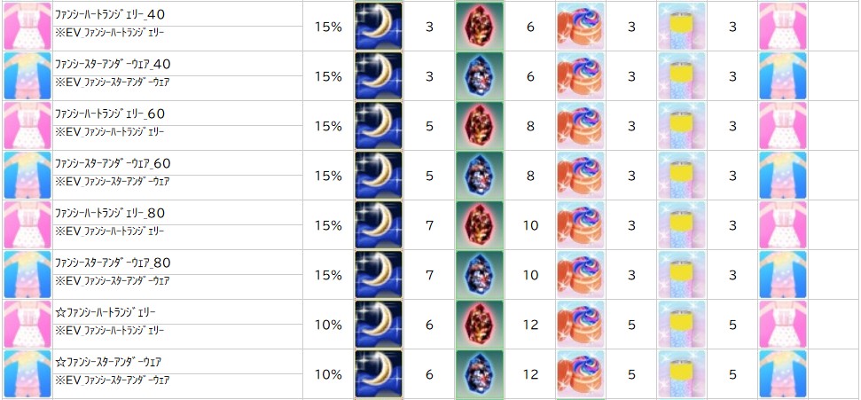 【 煌くファンシーマジカル調合書Ⅱ 入手イベントアイテム 】 ・☆ファンシーカジュアルコスチューム_L ・☆ファンシーカジュアルコスチューム_M ・☆ファンシーカジュアルコスチュームヘア_L ・☆ファンシーカジュアルコスチュームヘア_M ・☆ファンシースターアンダーウェア ・☆ファンシーハートランジェリー ・★あたまパステルアルパカ_イエロー ・★おさんぽファンシーウーパー ・★パステルアルパカイヤリング_L ・★パステルアルパカイヤリング_M ・★パステルアルパカバッグ_イエロー ・★パステルアルパカ浮き_イエロー ・1,000万ゴールド交換券 ・100万ゴールド交換券 ・500万ゴールド交換券 ・EV_おさんぽパステルアルパカ ・EV_カラフルハートチョーカー_L ・EV_カラフルハートチョーカー_M ・EV_パステルアルパカイヤリング_L ・EV_パステルアルパカイヤリング_M ・EV_パステルアルパカバッグ_パープル ・EV_パステルアルパカ浮き_パープル ・EV_パステルパールシェルソファ ・EV_パステル噴水フロート ・EV_ファンシーカジュアルコスチューム_L ・EV_ファンシーカジュアルコスチューム_M ・EV_ファンシーカジュアルコスチュームヘア_L ・EV_ファンシーカジュアルコスチュームヘア_M ・EV_ファンシースターアンダーウェア ・EV_ファンシーハートランジェリー ・EV_ファンシーリボンイヤリング_L ・EV_ファンシーリボンイヤリング_M ・EV_ポップリュックサック ・お友達の素 ・お友達の素_パステルアルパカ専用 ・お友達の素_ファンシーウーパー専用 ・ときめくパステルインク ・パステルアルパカー調合パーツ ・パステルアルパカドール_イエロー ・パステルアルパカドール_パープル ・パステルアルパカの毛玉 ・パステルクォーツ ・パステルシェルフ ・パステルシャンデリア ・パステルチェスト ・パステル家具コレクションⅡ ・ファンシーウーパードール ・ファンシーカジュアルコスチューム_L ・ファンシーカジュアルコスチューム_M ・ファンシーカジュアルコスチュームヘア_L ・ファンシーカジュアルコスチュームヘア_M ・ファンシーソファ_Left ・ファンシーソファ_Right ・ファンシーワックス ・ポップなバッテリー ・純粋青稲妻のかけら ・純粋青稲妻パウダー ・純粋赤彗星のかけら ・純粋赤彗星パウダー ・不思議なシャボン玉液 ・魔法の銀の破片 ・魔法の銀貨 ・煌めくパステルリボン