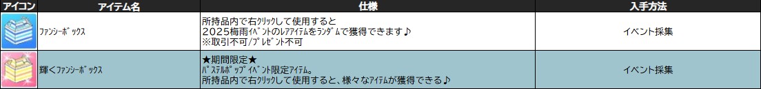 【 ファンシーボックス 入手イベントアイテム 】 ・[M]キャンディ_[カラフルラブリー❤] ・[M]キャンディ_[キュートポーズ] ・[M]キャンディ_[バウンシングバブル☆] ・[M]キャンディ_[パステルラブハート] ・[M]キャンディ_[バブルブロウ★] ・[M]キャンディ_[ファンシースターダンス] ・100万ゴールド交換券 ・10万ゴールド交換券 ・5,000ゴールド交換券 ・500万ゴールド交換券 ・50万ゴールド交換券 ・5万ゴールド交換券 ・EV_パステルアルパカハンドバッグ_L ・EV_パステルアルパカハンドバッグ_M ・EV_ファンシーキーチェーン ・EV_ファンシーハートネックレス_L ・EV_ファンシーハートネックレス_M ・アップルスプーン ・お祝いクラッカー ・お友達の素_パステルアルパカ専用 ・お友達の素_ファンシーウーパー専用 ・パステルアルパカの毛玉 ・パステルカラービーズ ・パステルギフトバルーン ・パステルクォーツ ・パステルスター_A ・パステルスター_B ・パステルスター_C ・パステルスタイルコレクションⅡ ・パステルチェスト ・パステルバブル ・パステル材料コレクションⅡ ・ファンシー★リサイクル調合書 ・ファンシーソファ_Left ・ファンシーソファ_Right ・ファンシーマジカル調合書Ⅱ ・ファンシーワックス ・フォーチュンコイン ・ポップなバッテリー ・もろい青稲妻のかけら ・もろい青稲妻パウダー ・もろい赤彗星のかけら ・もろい赤彗星パウダー ・ワイドスターマインA ・ワイドスターマインB ・輝くパステルバブル ・輝くパステルボール ・極みハニーグルテン ・月の涙 ・中級クラッカー ・中級ポータル注文書 ・魔法の青銅の破片 ・魔法の青銅貨 ・魅惑の月の涙